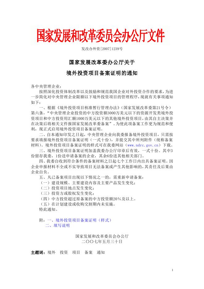 (12)发改办外资(2007)1239号《国家发展改革委办公厅关于境外投资项目备案证明的通知》