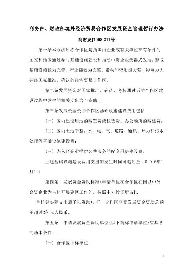 (18)商财发(2008)211号《境外经济贸易合作区发展资金管理暂行办法》