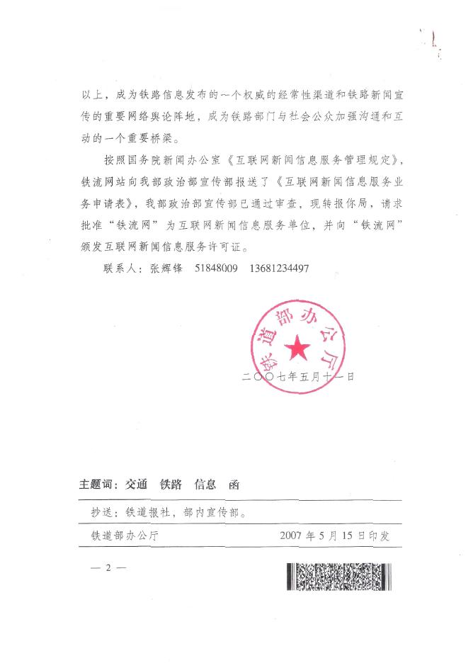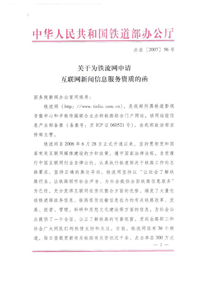 (22)中华人民共和国铁道部办公厅《关于铁流网申请互联网新