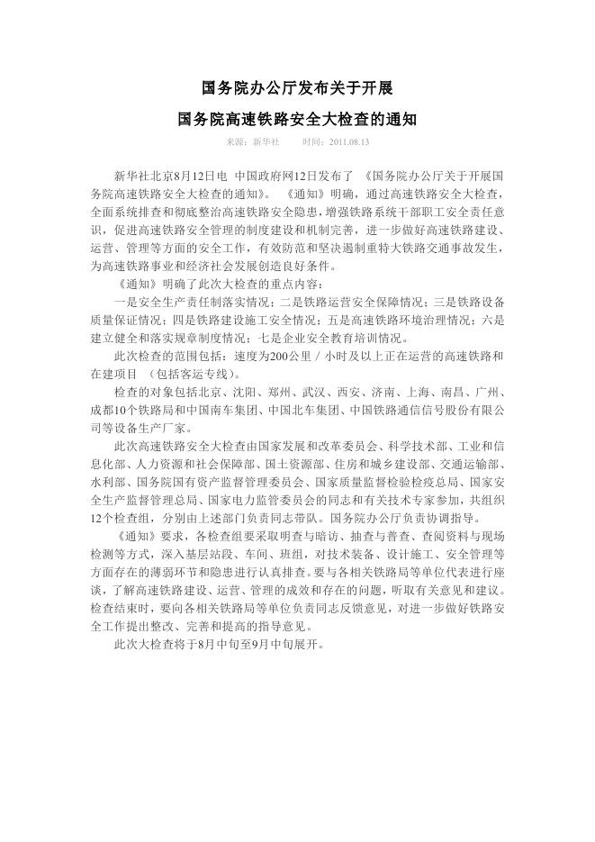 (10)国务院办公厅发布关于开展国务院高速铁路安全大检查的通知