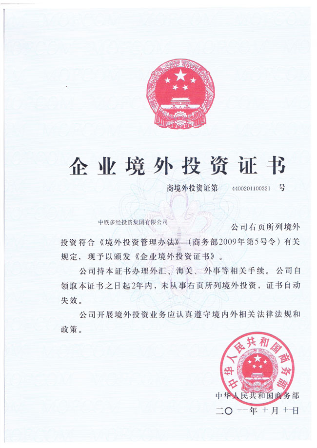 (25)中华人民共和国商务部《企业境外投资证书》商境外投资证第4400201100321