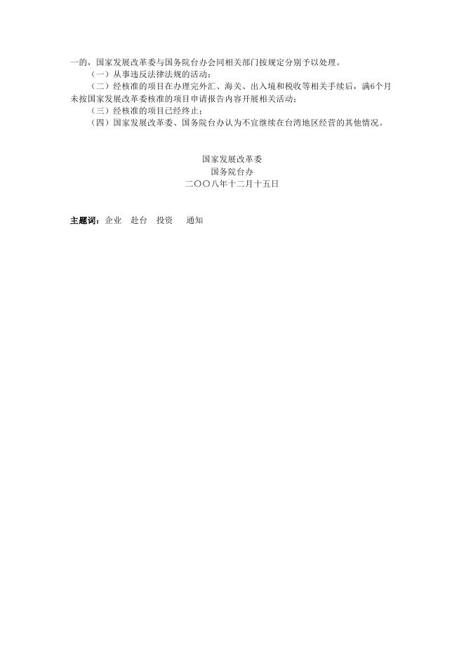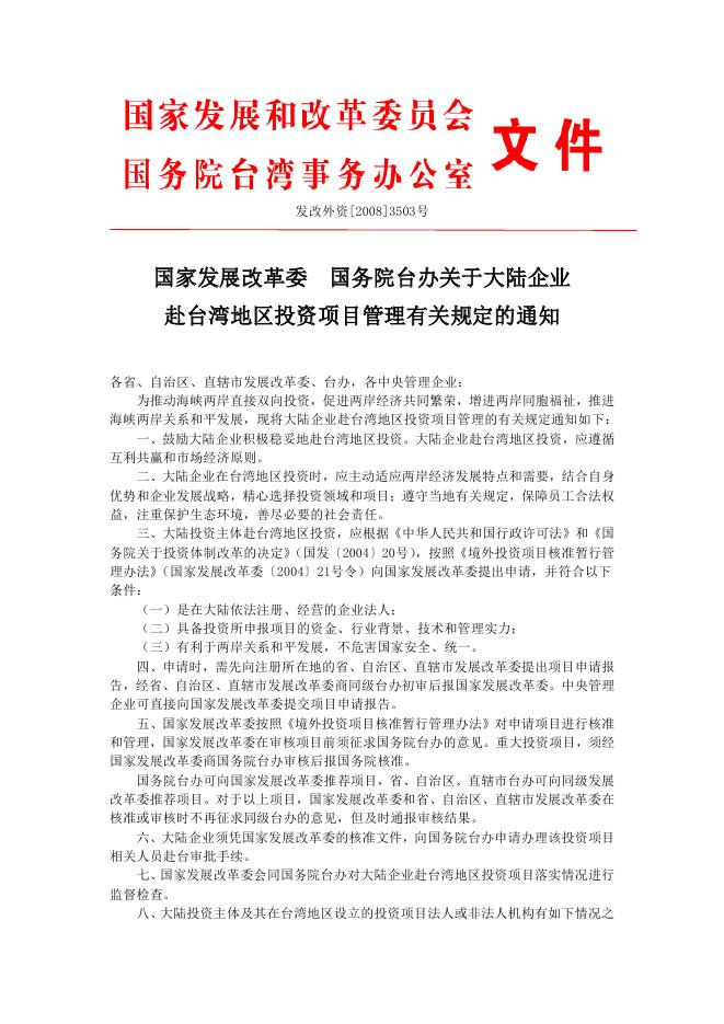 (13)发改外资(2008)3503号《国家发展改革委,国务院台办关于大陆企业赴台湾地区投资项目管理有关规定的通知》