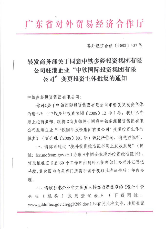 (11)广东省对外贸易经济合作厅,粤外经贸合函(2008)437号《转发商务部关于同意中铁多经投资集团有限公司驻港企业“中铁国际投资集团有限公司”变更投资主体批复的通知》