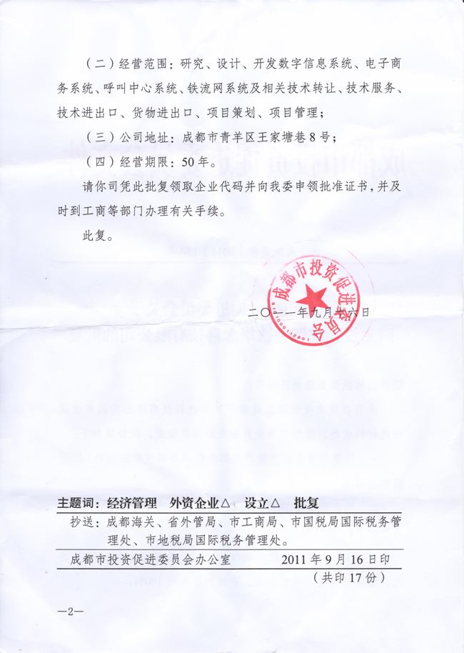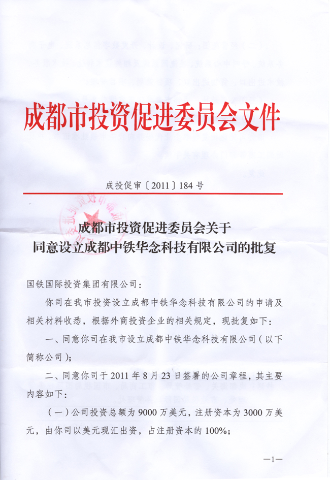 (26)《成都市投资促进委员会关于同意设立成都中铁华念科技有限公司的批复》成投促审(2011)184号