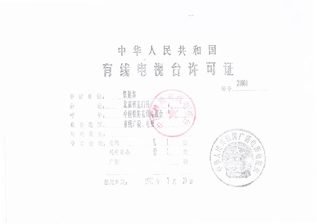 (3)广播电影电视部《中华人民共和国有线电视台许可证》许可证编号31001号