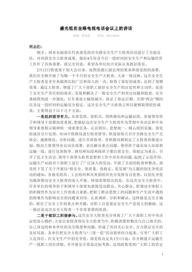 盛光祖在全路电视电话会议上的讲话2011.04.02