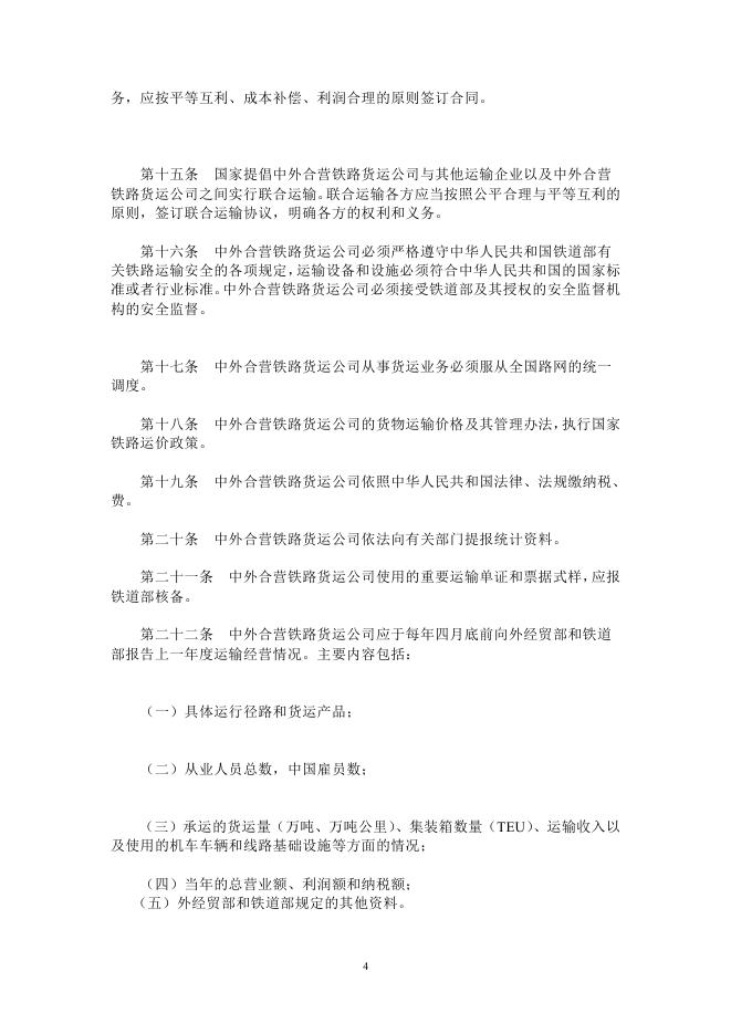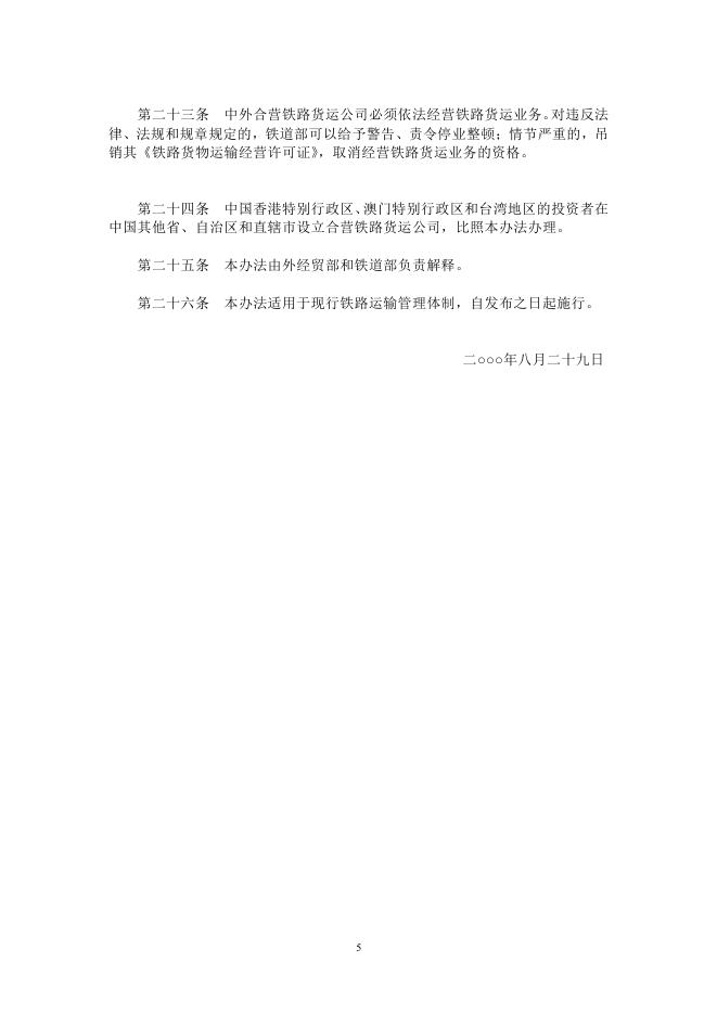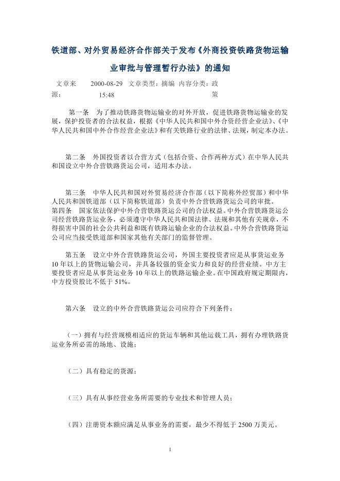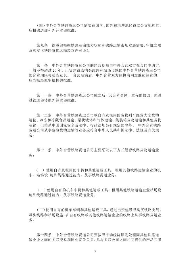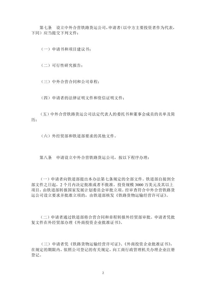 (8)2008年8月29日铁道部、对外贸易经济合作部关于发布《外商投资铁路货物运输业审批与管理暂行办法》的通知