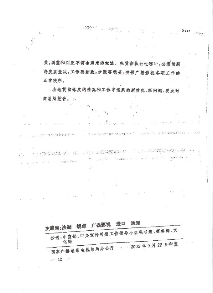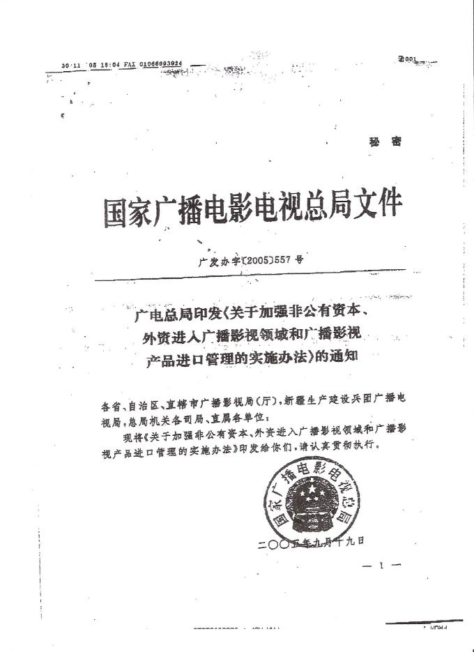 (52)广电办字(2005)557号,《广电总局印发<关于加强非公有资本、外资进入广播影视领域和广播影视产品进口管理的实施办法的通知>》