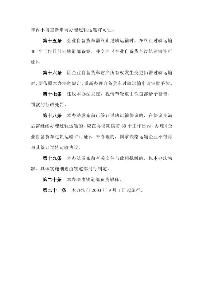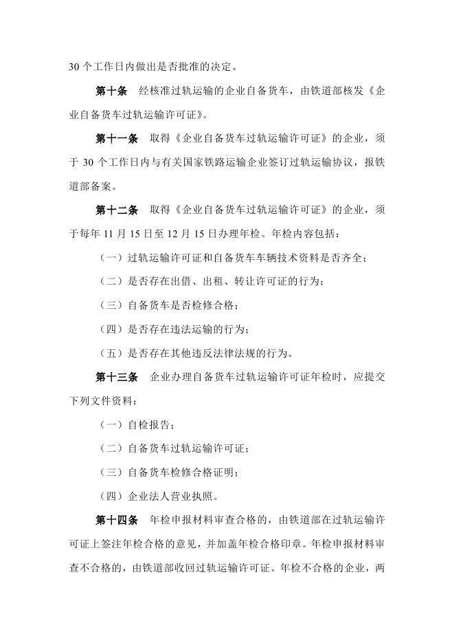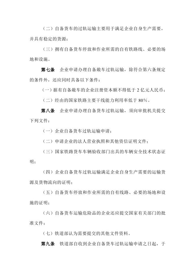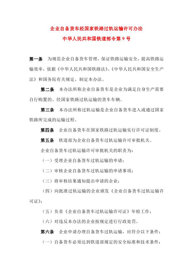 (6)中华人民共和国铁道部令第9号《企业自备货车经国家铁路过轨运输许可办法》